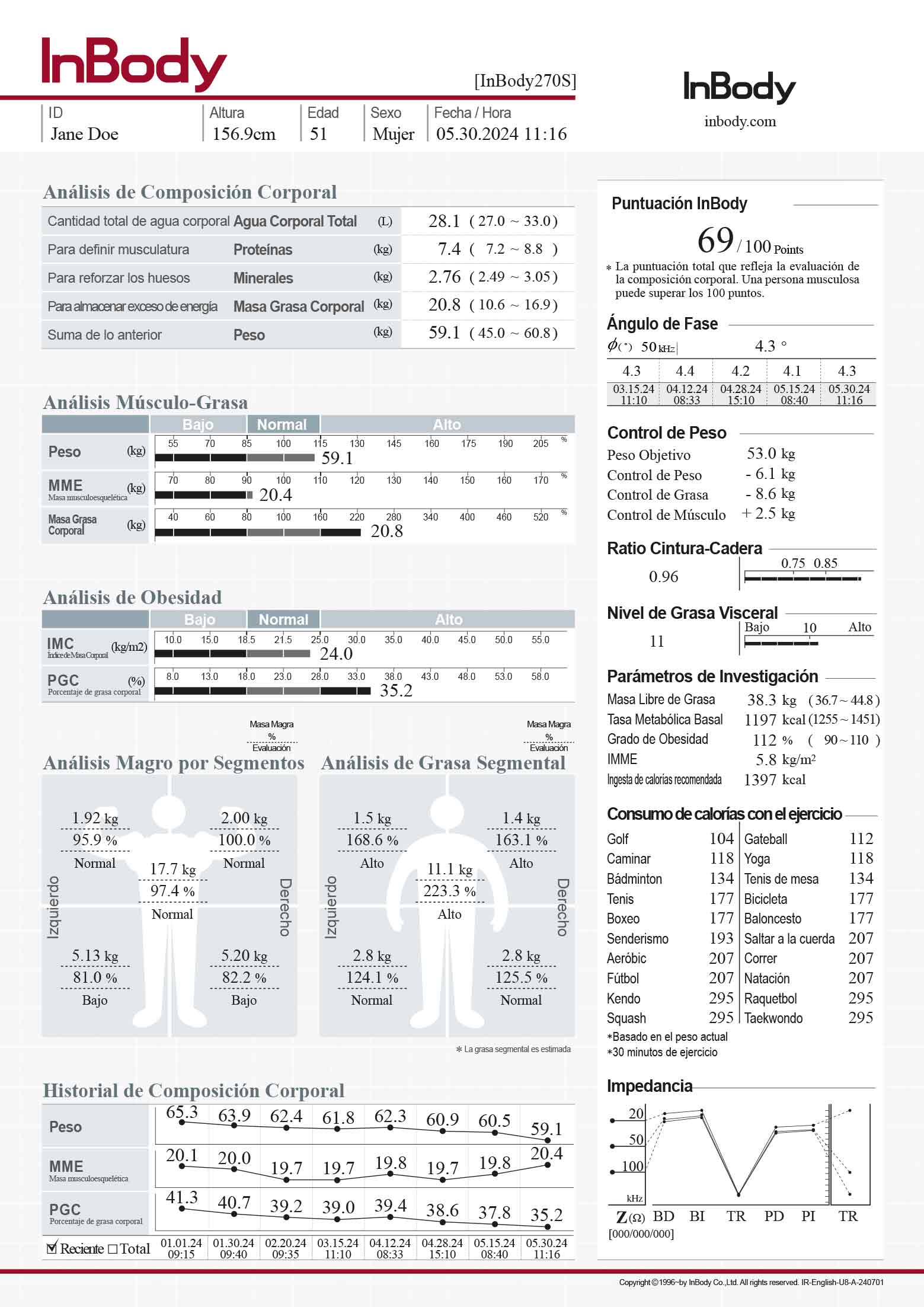 Ángulo de Fase (a 50 kHz), Agua Corporal Total, Proteína, Mineral óseo/no óseo, Masa Grasa Corporal, Masa Magra, Masa Libre de Grasa, Peso, Masa de Músculo Esquelético(MME), Indice de Masa Corporal(IMC), Porcentaje de Grasa Corporal(PGC), Masa Magra Segmental, Proporción de Masa Magra Segmental, AEC/ACT Total, Historial de Composición Corporal(8 Resultados Acumulados), Puntaje InBody, Control de Peso(Peso Ideal, Peso, Grasa, Músculo), Evaluación de Obesisdad(IMC, PGC), Evaluación de Equilibrio Corporal, Análisis de Grasa Segmental, Agua Intracelular, Agua Extracelular, Metabolismo Basal(MB), Relación Cintura/Cadera, Nivel de Grasa Visceral, Grado de Obesidad, Mineral Óseo Contenido, Masa Celular Corporal, Circunferencia de Brazo, Circunferencia de Músculo de Brazo, Gráfico de impedancia (de cada segmento y frecuencia).