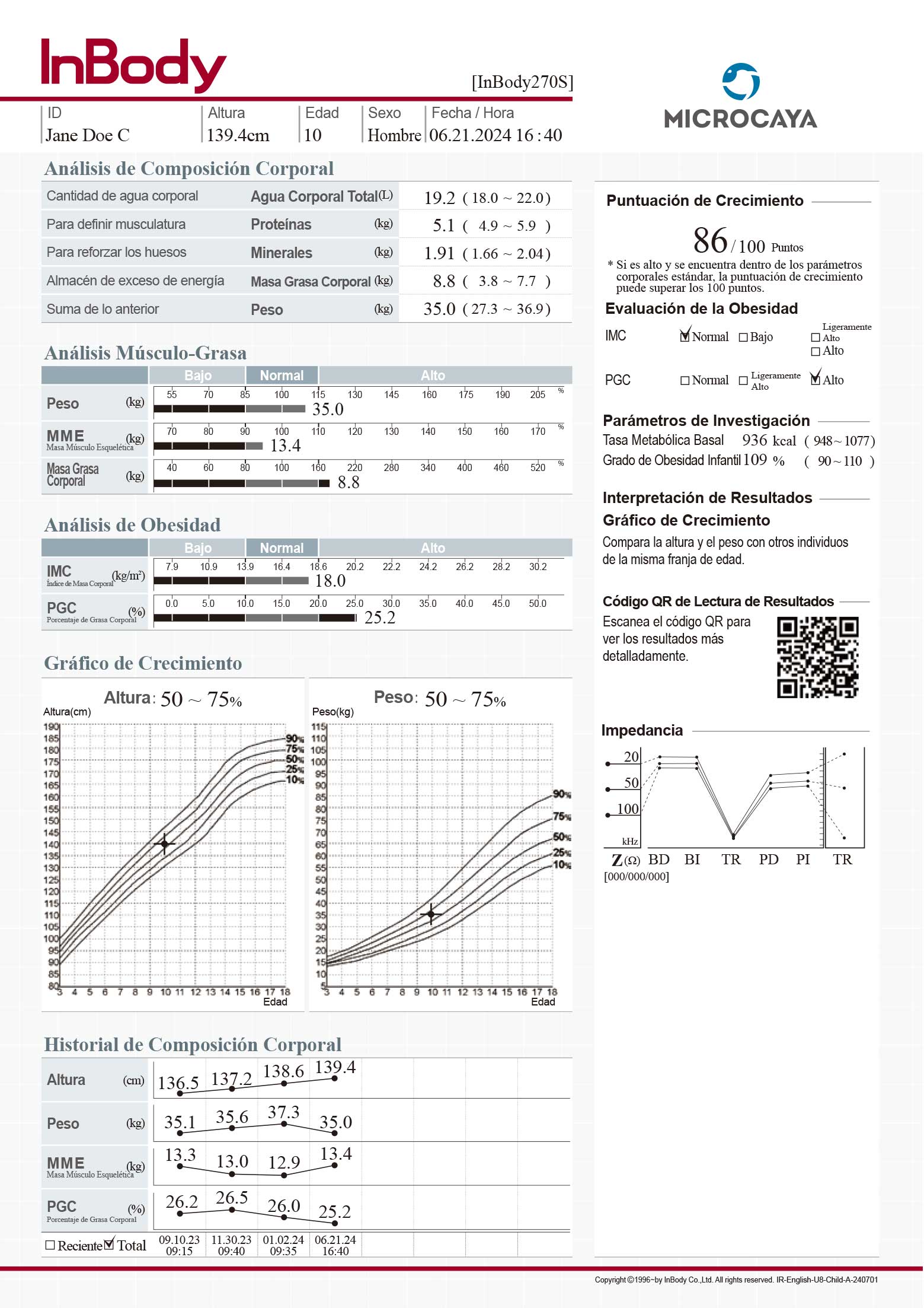 Agua Corporal Total, Proteína, Mineral, Masa Grasa Corporal, Peso, Masa de Músculo Esquelético(MME), Masa Grasa Corporal, Indice de Masa Corporal(IMC), Porcentaje de Grasa Corporal(PGC), Tabla de Crecimiento(Estatura, Peso), Historial de Composición Corporal(8 Resultados Acumulados), Puntaje de Crecimiento, Evaluación de Obesisdad(IMC, PGC), Evaluación Nutricional(Proteína, Mineral, Masa Grasa), Evaluación de Equilibrio Corporal, Análisis de Masa Magra Segmental, Agua Intracelular, Agua Extracelular, Metabolismo Basal(MB), Grado de Obesidad Infantil, Mineral Óseo Contenido, Masa Celular Corporal, Gráfico de impedancia (de cada segmento y frecuencia).