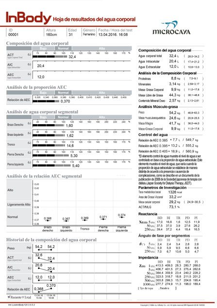 Se aportan varios datos nutricionales como tasa metabólica basal, área de grasa visceral, masa celular corporal o agua corporal total/masa libre de grasa, entre otros. E